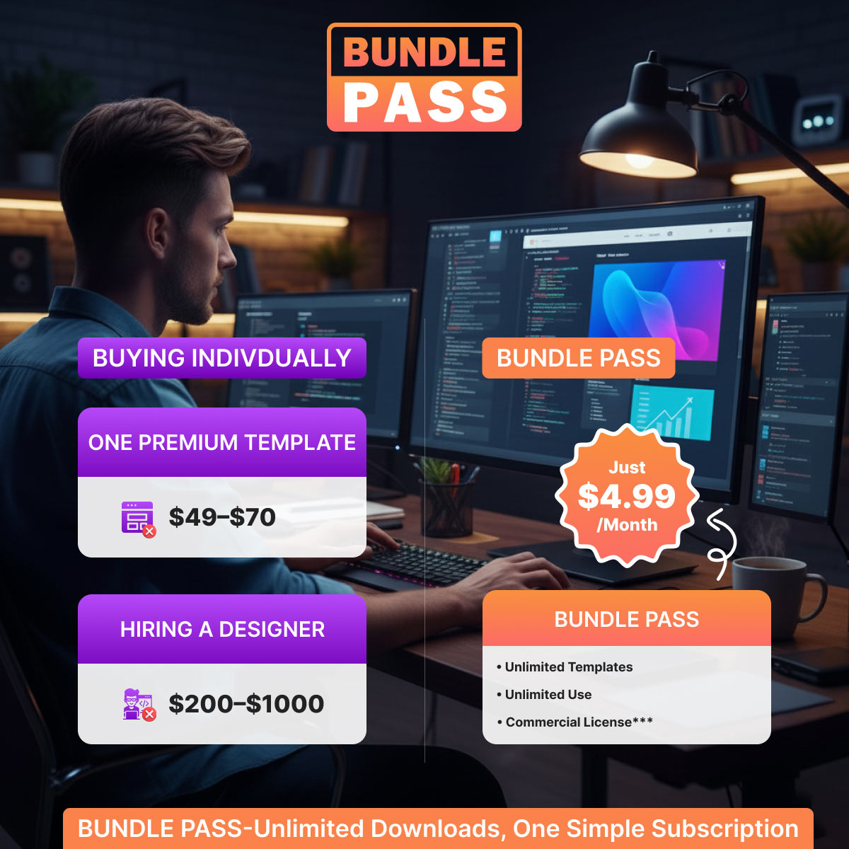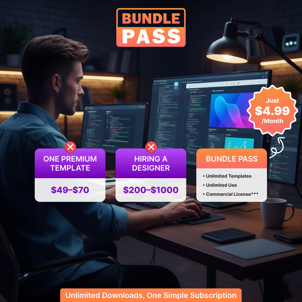 BUNDLE PASS: Unlimited downloads, 24/7 support, free updates, and commercial license for just $4.99/month. Designed for freelancers, agencies, startups, and small businesses.